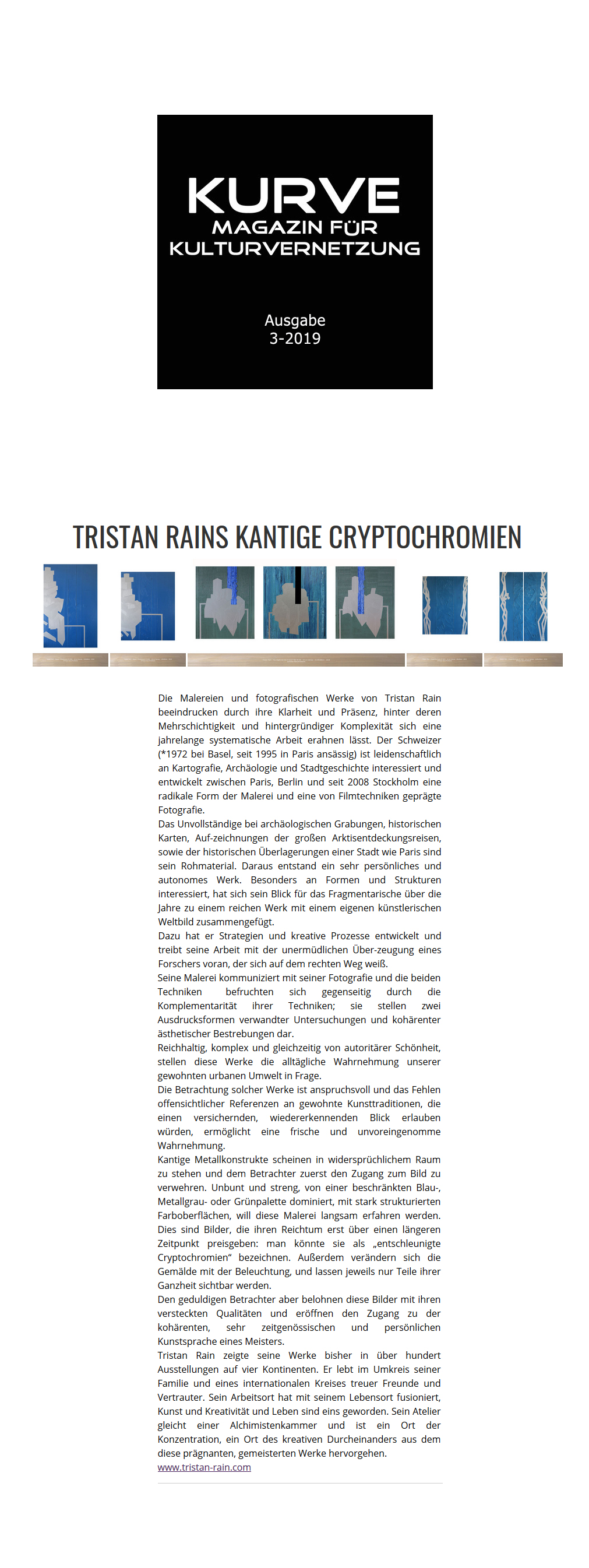 - "Tristan Rain kantige Cryptochromien", Kurve, Online-Magazine für Kunst-Networking, Österreich, Ausgabe Juli 2019