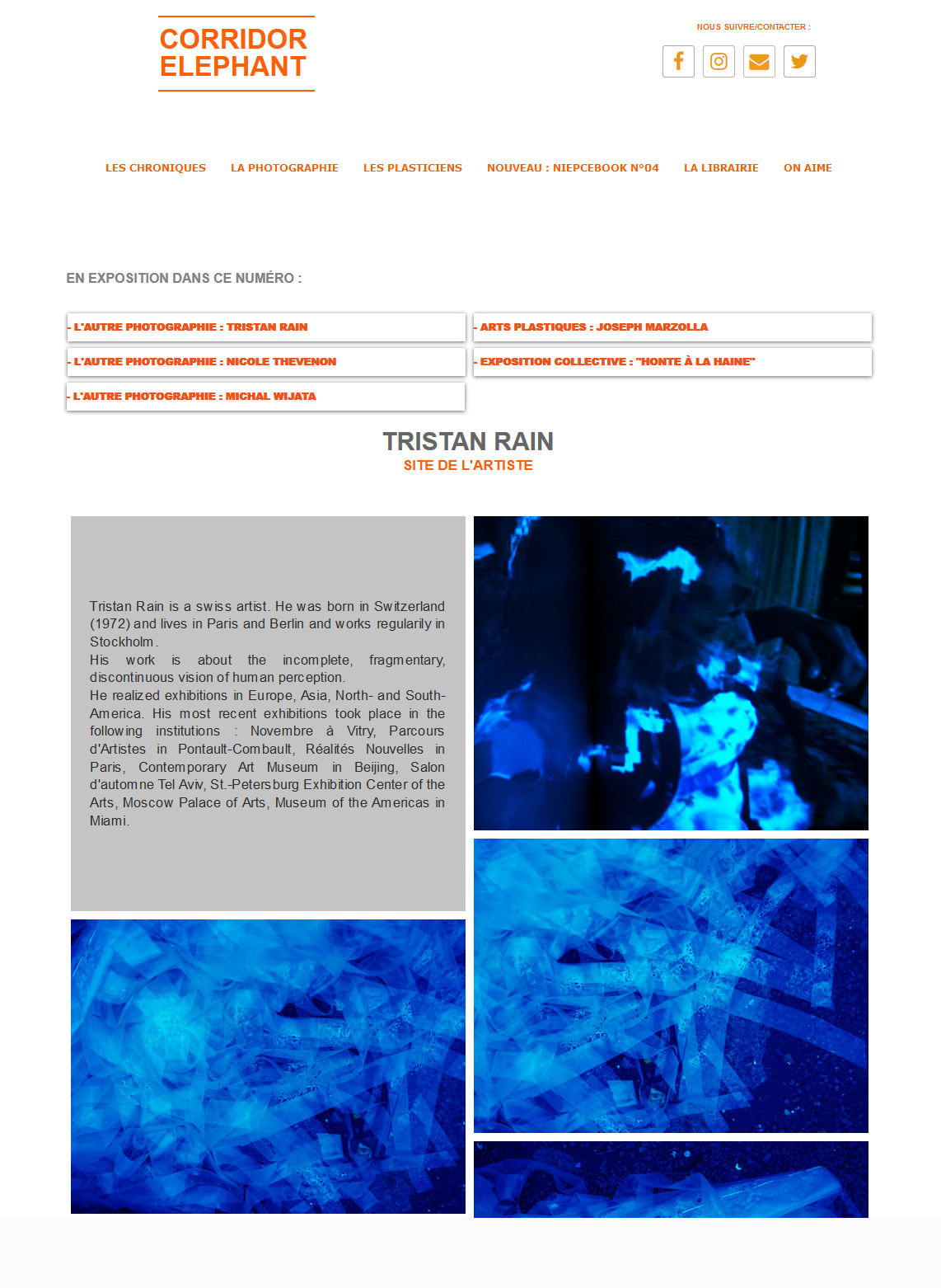 - "L'autre photographie: Tristan Rain", corridorelephant magazine d'art contemporain et de la photographie (online), Ed. jan. 2017