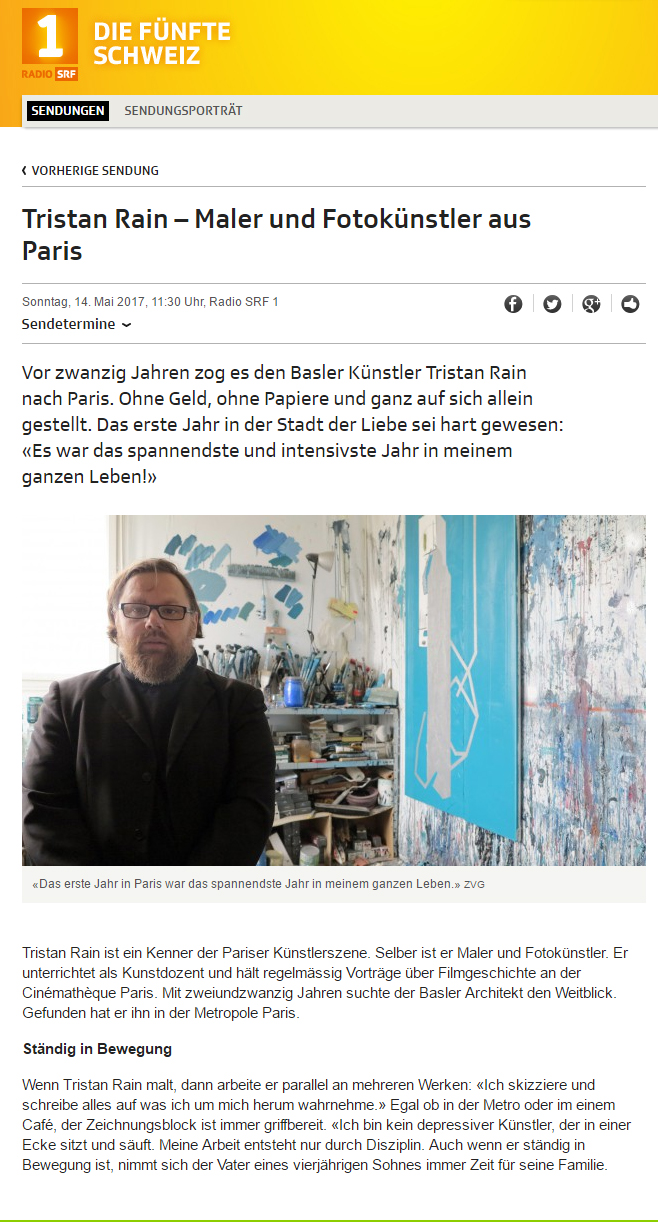 -Tristan Rain Maler und Fotokünstler in Paris, Live-Gespräch mit Christina Lang, Schweizer Radio, SRF1, Erstausstrahlung am 14 Mai 2017 (Schweizer Dialekt) + Programmseite