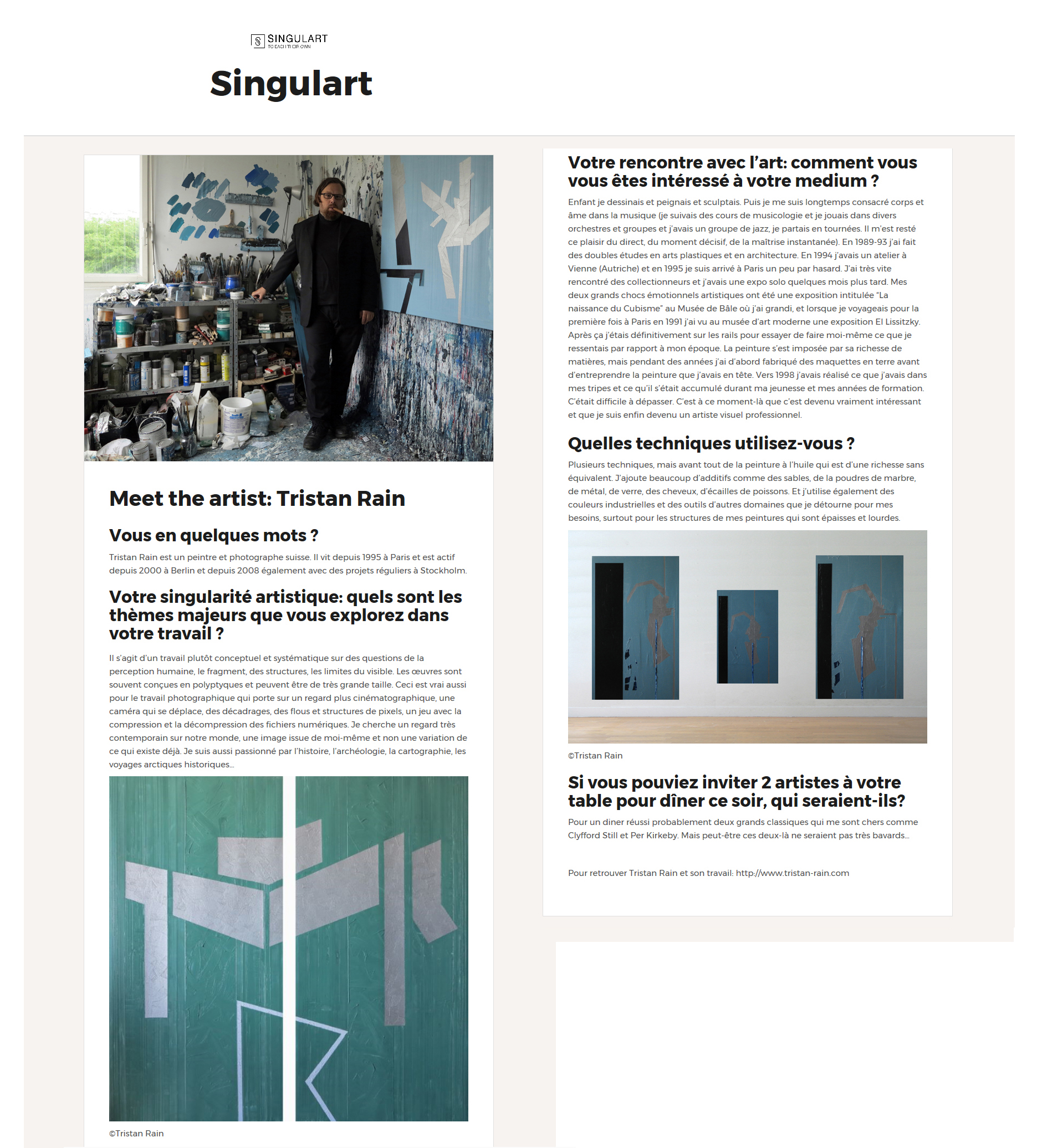 - "Meet the Artist: Tristan Rain", singulart, OnlineKunstMagazin (online), Ed. Juni 2017
